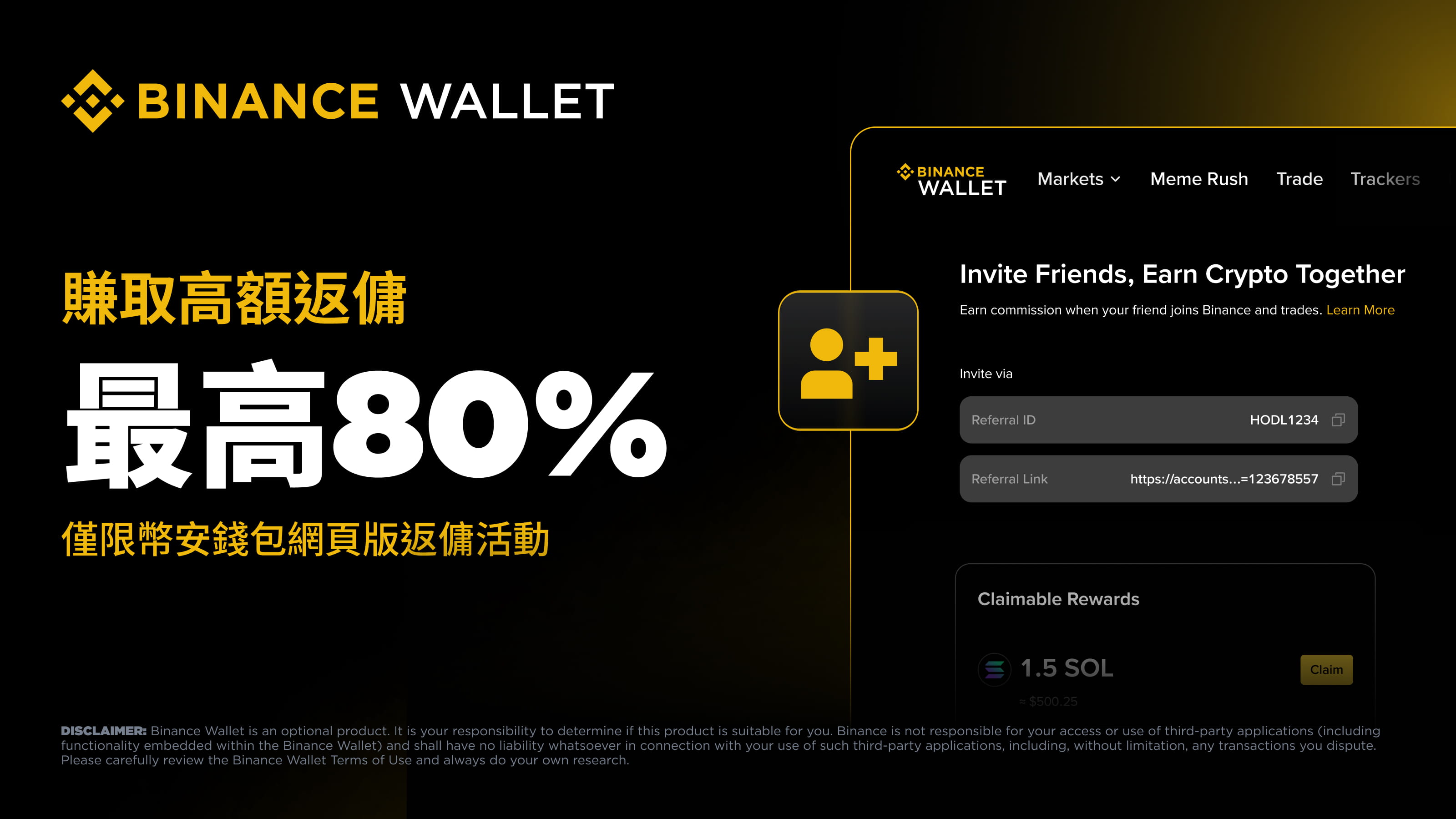 參與返傭活動,用戶需使用幣安賬號登錄幣安錢包(網頁版)。符合條件的用戶可生成專屬邀請碼,邀請好友,並根據好友的交易情況獲取獎勵。適用條款與細則。
