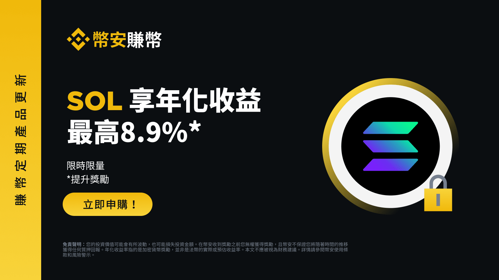 幣安賺幣平台將推出Solana(SOL)定期產品專屬活動!活動期間申購SOL定期產品的用戶,享最高8.9%*年化收益率。