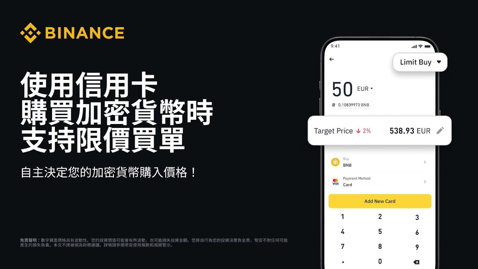 用戶現可透過幣安「購買加密貨幣」服務設定限價買單。用戶可在幣安網頁端和幣安Pro App端使用信用卡或簽帳卡購買加密貨幣時,使用此功能。