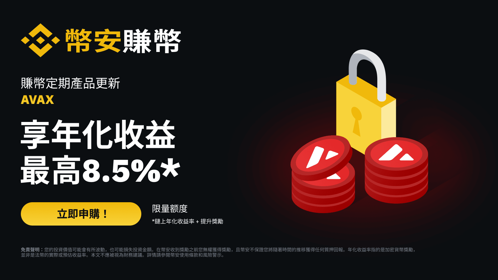 幣安賺幣平台將更新AVAX定期產品,2023年12月19日20:00(東八區時間)起申購即可享最高8.5%年化收益率,邀您體驗。