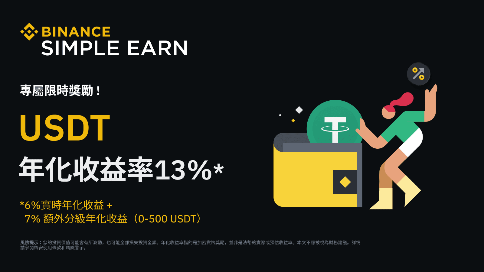 幣安賺幣平台將推出USDT活期產品活動!活動期間,申購USDT賺幣活期產品,除了可獲得實時年化收益之外(約6%),還可享受7%獨家額外分級年化收益!