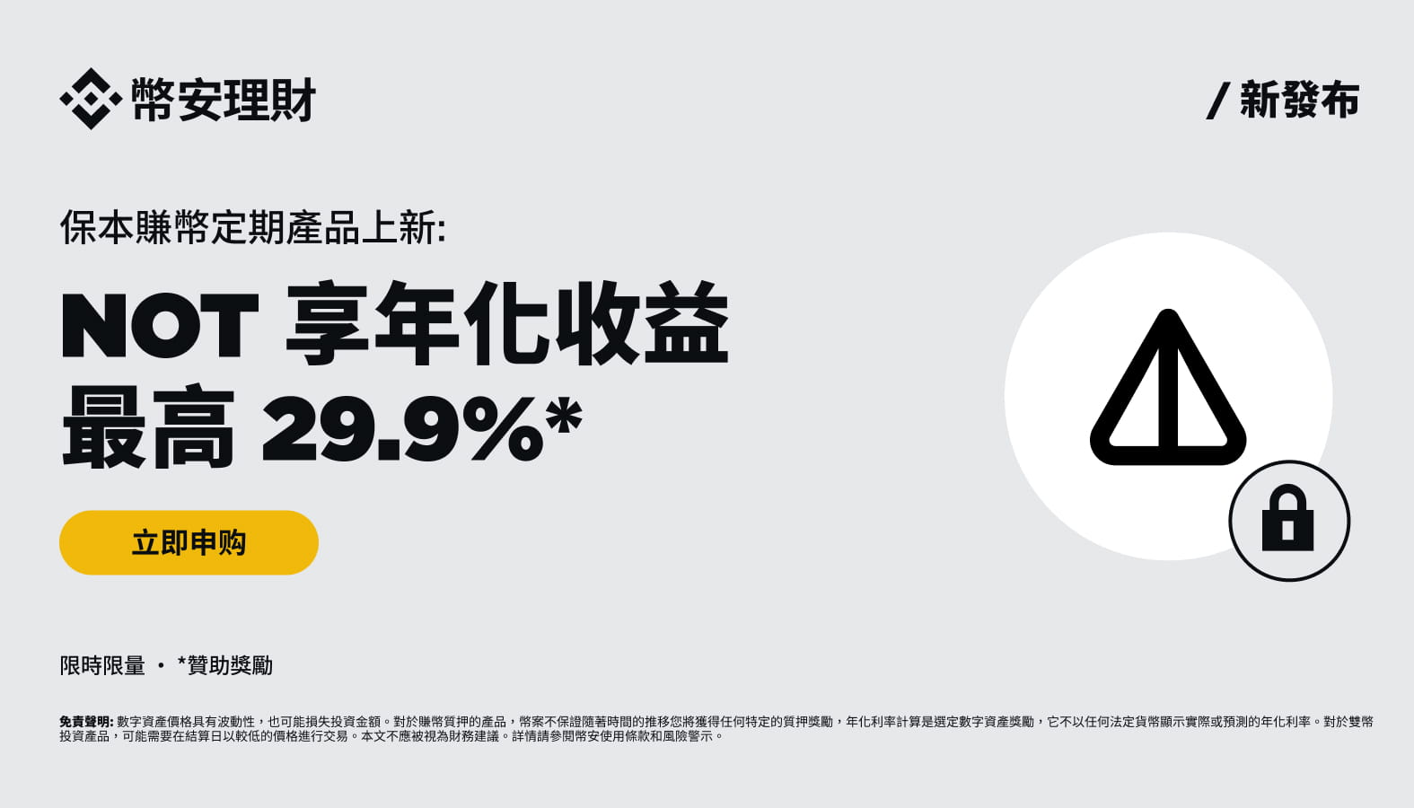 幣安保本賺幣平台將推出Notcoin(NOT)定期產品專屬活動!活動期間申購NOT定期產品的用戶,享最高29.9%*年化收益率。