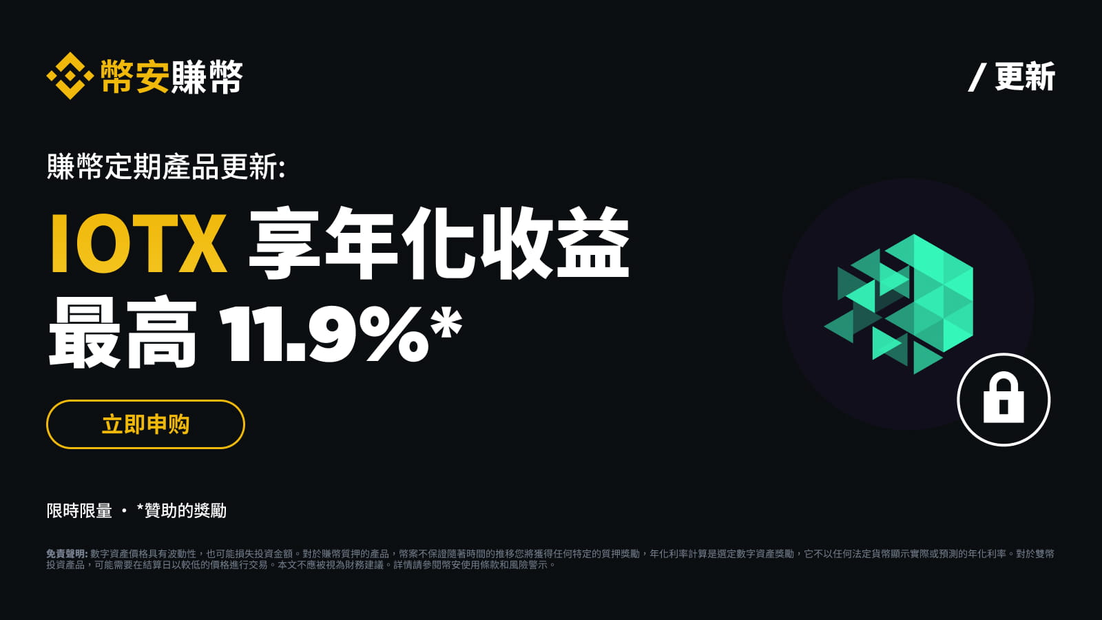 幣安賺幣平台將推出IoTeX(IOTX)定期產品專屬活動!活動期間申購IOTX定期產品的用戶,享最高11.9%*年化收益率。