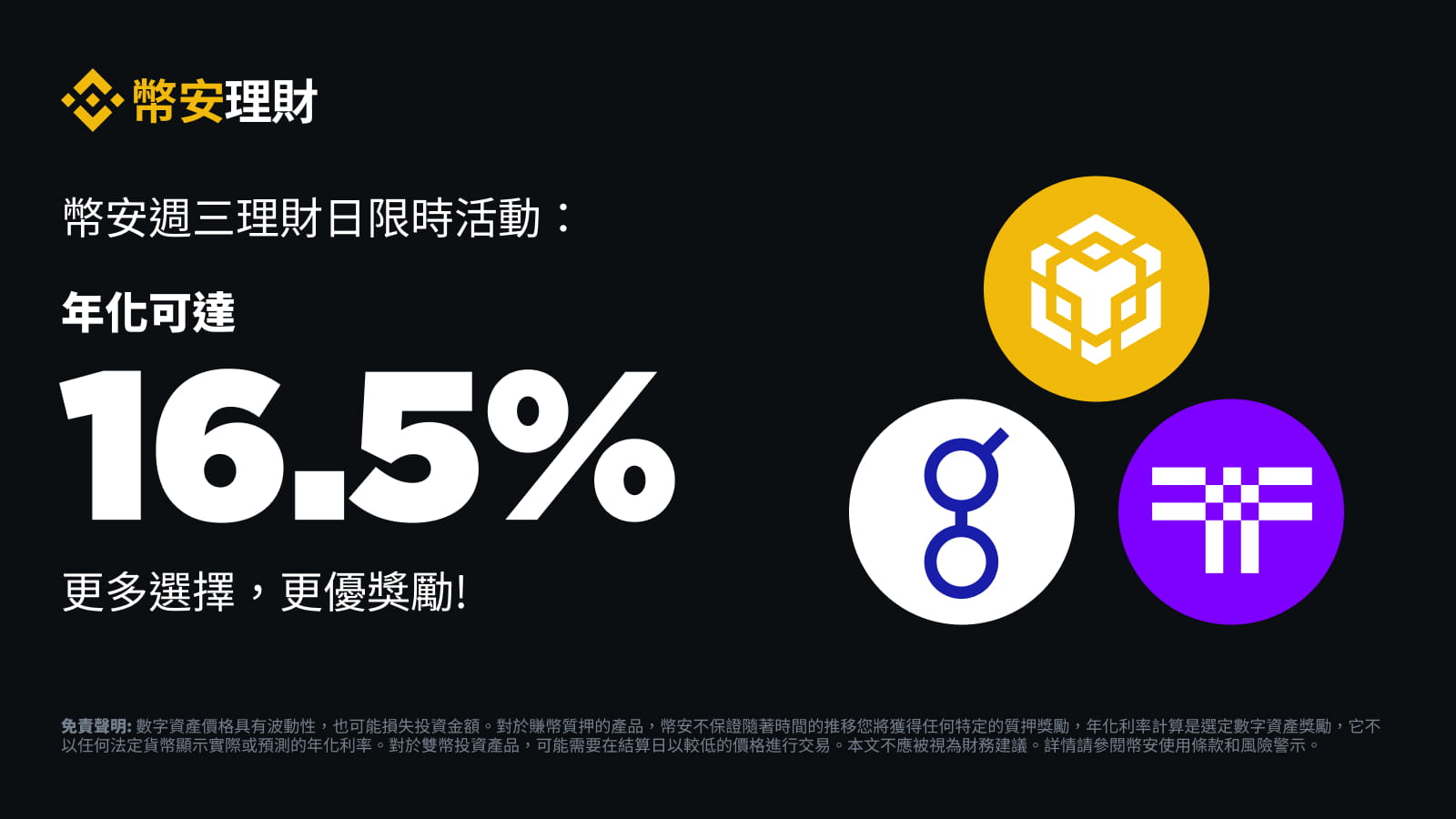 幣安理財每週三為您推出一系列新限時活動。請持續關注“幣安週三理財日”,透過幣安保本賺幣、ETH 質押、雙幣投資等獲得收益。