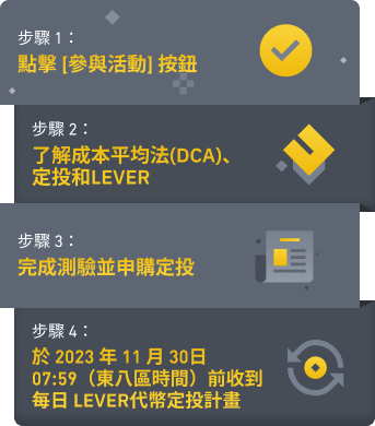 活動期間,前35,000名成功完成測驗,申購任意定投計畫且申購總額不低於10美元等值的用戶,將可獲得為期20天的免費每日LEVER定投計畫。