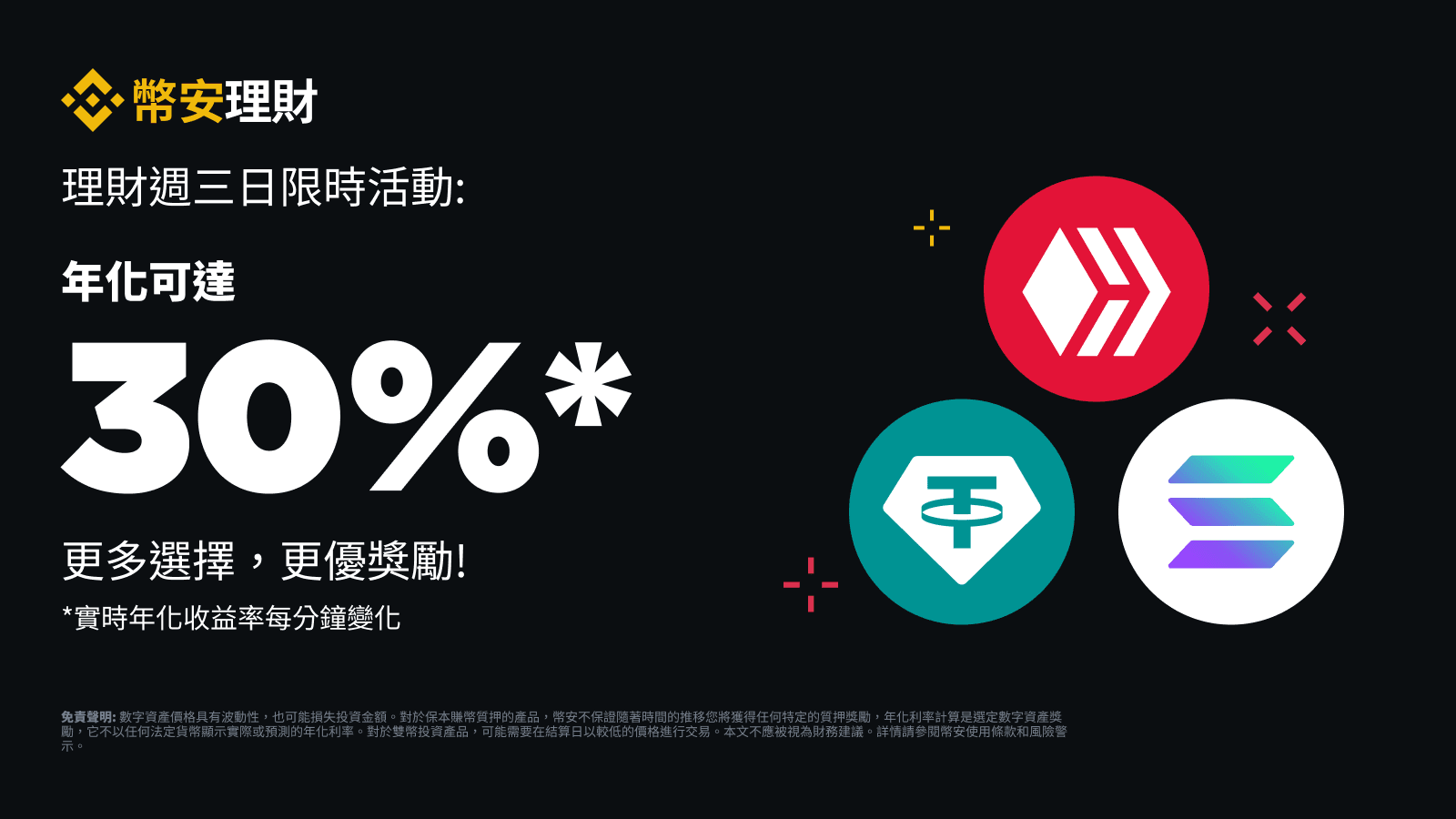 幣安理財每週三為您推出一系列新限時活動。請持續關注“幣安週三理財日”,透過幣安保本賺幣、ETH質押、SOL質押、雙幣投資等獲得收益。