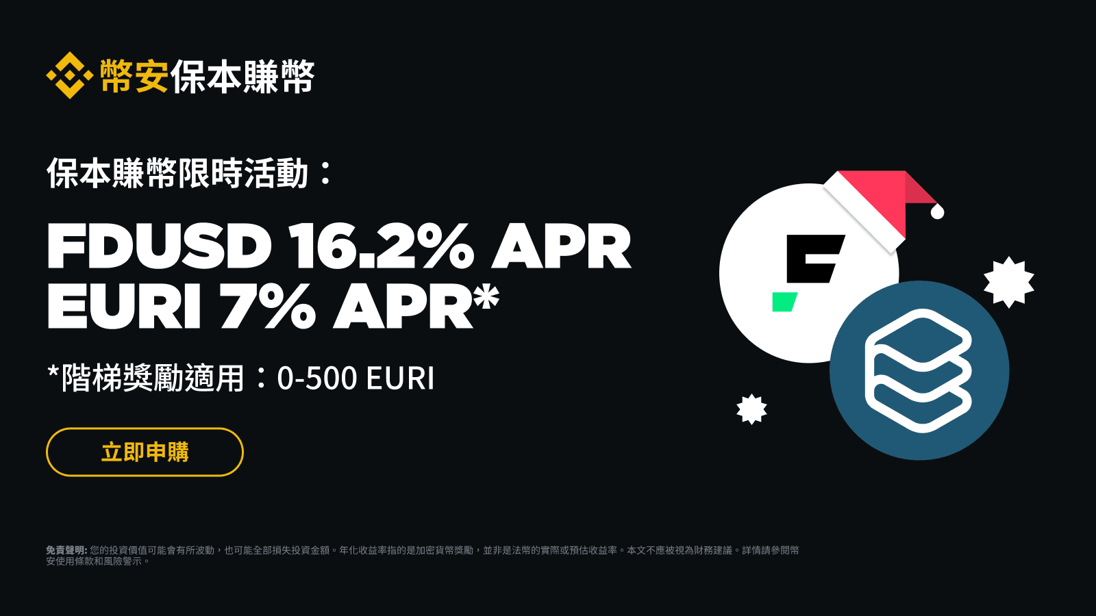 年化收益來源為幣安的自有資金,發放金額將根據對當前市場狀況的評估和評價而定。本活動與FDUSD或EURI發行方無關;