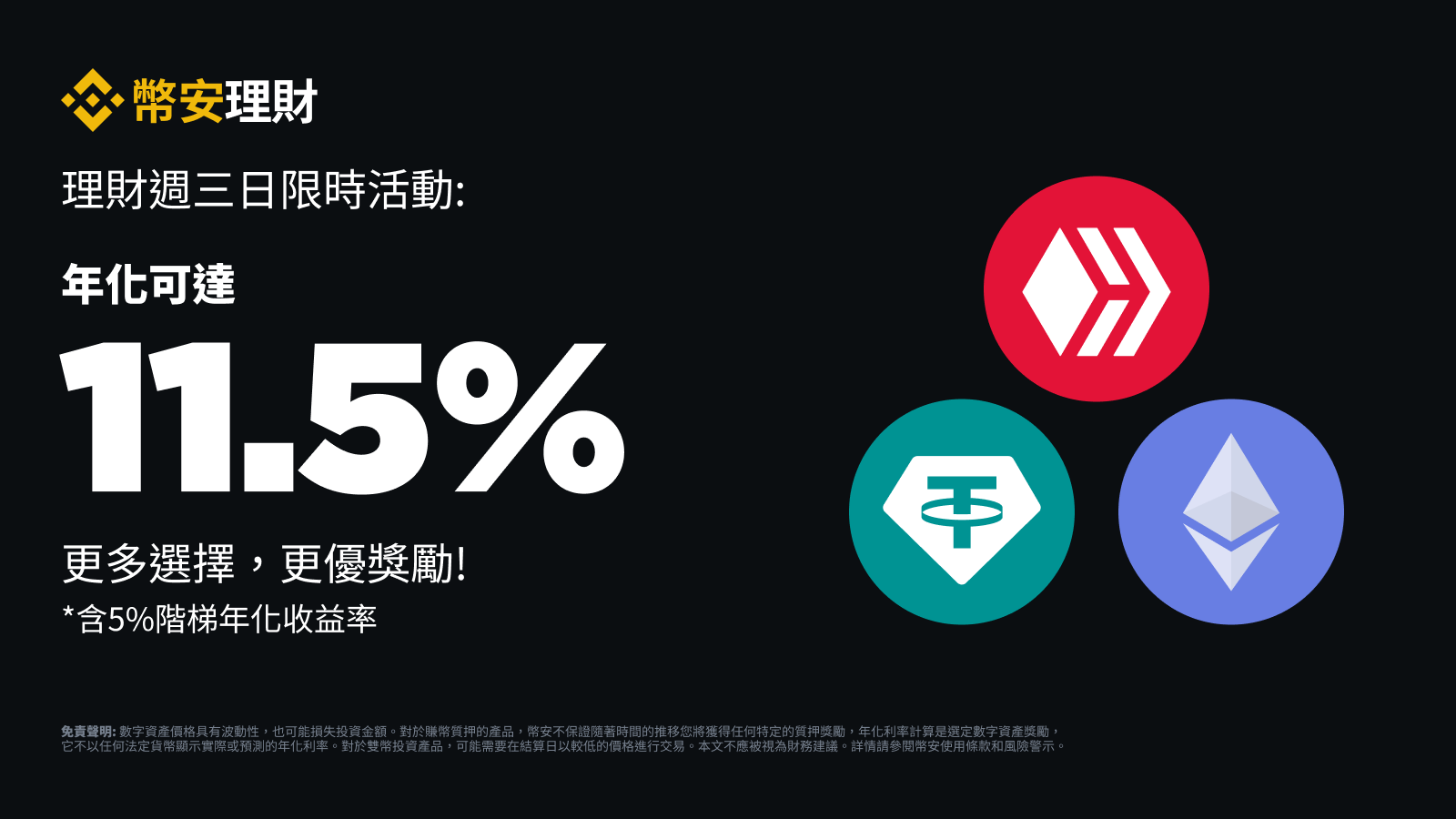 免責聲明:數字資產價格具有波動性,您的投資價值可能會有所波動,也可能損失投資金額。您將自行為您的投資決策負全責,幣安不對任何可能產生的損失負責。保本賺幣質押產品將在協議期結束後或提前贖回時將數字資產返還至用戶的現貨錢包。幣安不保證隨著時間的推移您將獲得任何特定的質押獎勵。年化收益率是您在選定時間範圍內獲得數字資產獎勵的預估值。它不以任何法定貨幣顯示實際或預測的回報率、收益率。年化收益率每日調整,預計收益可能與實際產生的收益不同。對於雙幣投資產品,建議您持有加密資產並可能需要在結算日以低於市場利率的利率進行交易。本文不應被視為財務建議。詳情請參閱幣安使用條款和風險警示。