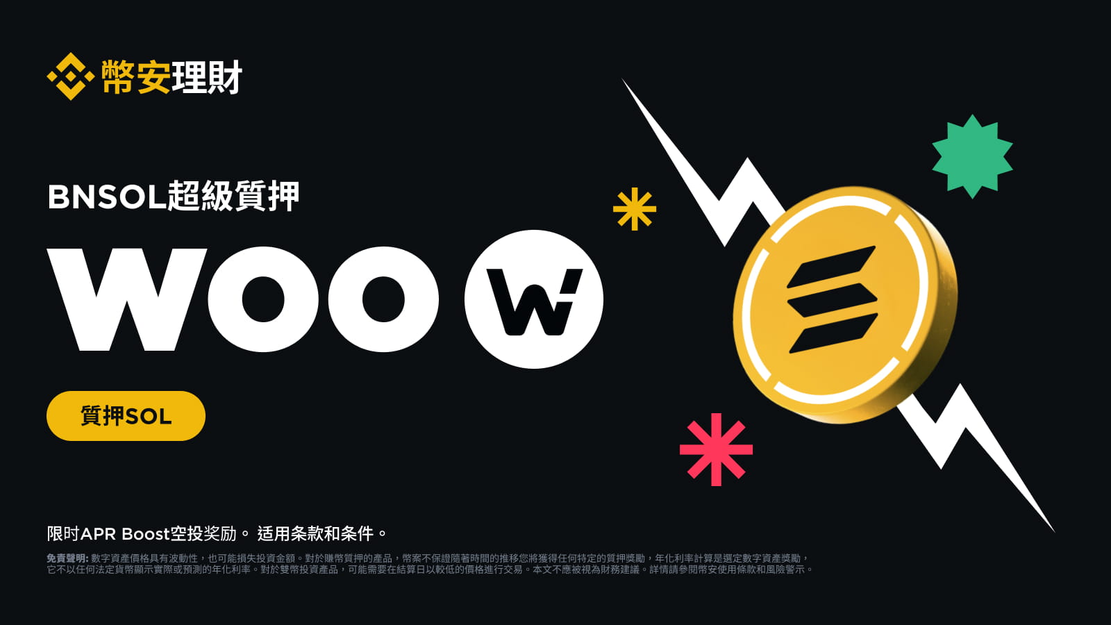 2024年12月17日08:00至2025年01月01日07:59(東八區時間)期間,在幣安帳戶和幣安錢包中持有BNSOL,或將SOL質押至BNSOL的用戶,將獲得WOO APR Boost空投獎勵。