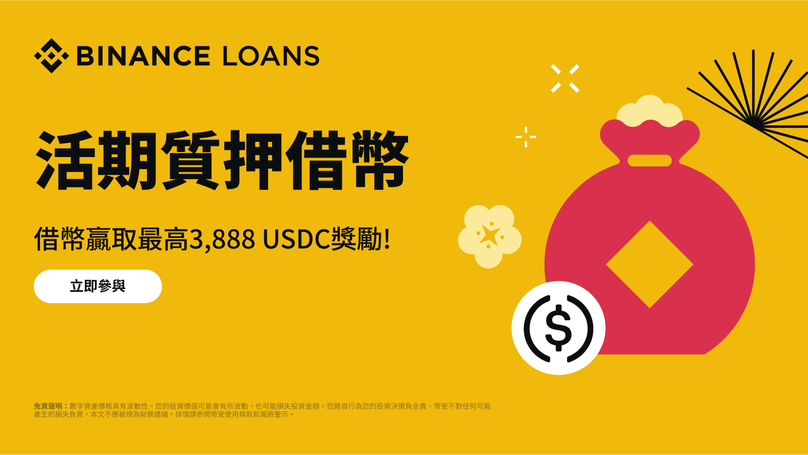 幣安與您一起歡慶春節,特別推質押借幣(活期利率)用戶專屬活動。活動期間,符合資格的用戶完成新的活期質押借幣,有機會獲得最高3,888 USDC獎勵。