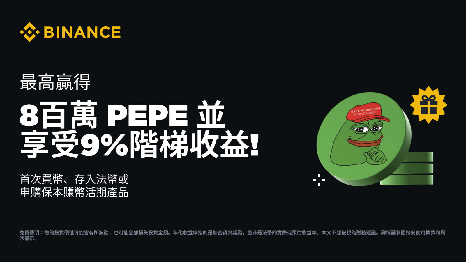 幣安推出特別活動!符合條件的用戶透過「買幣」功能完成首次加密貨幣購買或法幣儲值,將有機會獲得 600,000 PEPE 代幣券獎勵。此外,申購 PEPE、USDT、USDC 或 EURI 保本賺幣活期產品的用戶,還可贏取最高800 萬PEPE代幣券,並享受 PEPE 保本賺幣活期產品 9% 的階梯收益率獎勵。