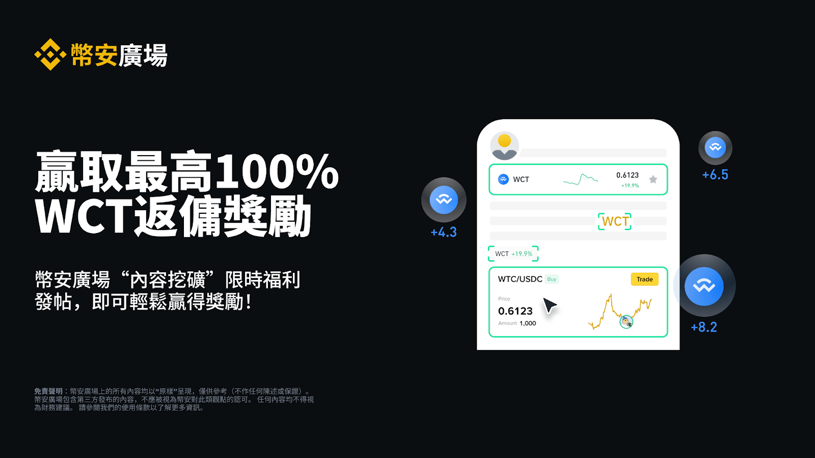 幣安廣場為所有幣安廣場“內容挖礦”創作者推出全新限時活動。符合條件的創作者在幣安廣場平台發布合格的內容作品,每人可從其讀者的WCT現貨、槓桿、合約交易中獲得最高100%的手續費返傭獎勵(獎勵以WCT 代幣券形式發放)。