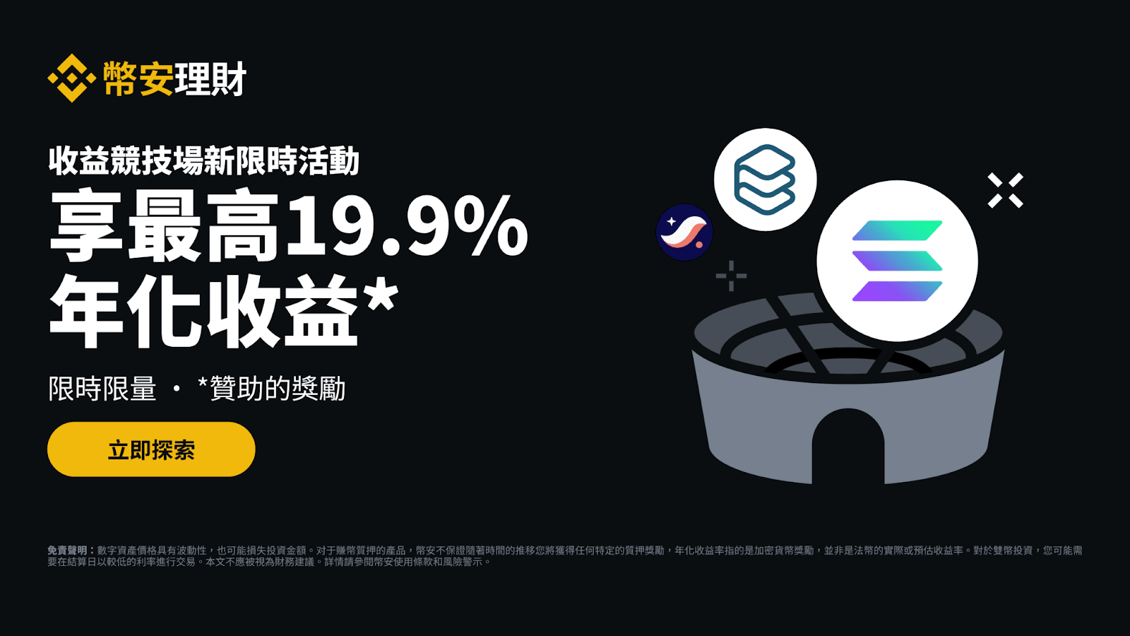 免責聲明:數字資產價格具有波動性,您的投資價值可能會有所波動,也可能損失投資金額。您將自行為您的投資決策負全責,幣安不對任何可能產生的損失負責。保本賺幣質押產品將在協議期結束後或提前贖回時將數字資產返還至用戶的現貨錢包。幣安不保證隨著時間的推移您將獲得任何特定的質押獎勵。年化收益率是您在選定時間範圍內獲得數字資產獎勵的預估值。它不以任何法定貨幣顯示實際或預測的回報率、收益率。年化收益率每日調整,預計收益可能與實際產生的收益不同。對於雙幣投資產品,建議您持有加密資產並可能需要在結算日以低於市場利率的利率進行交易。本文不應被視為財務建議。詳情請參閱幣安使用條款和風險警示。
