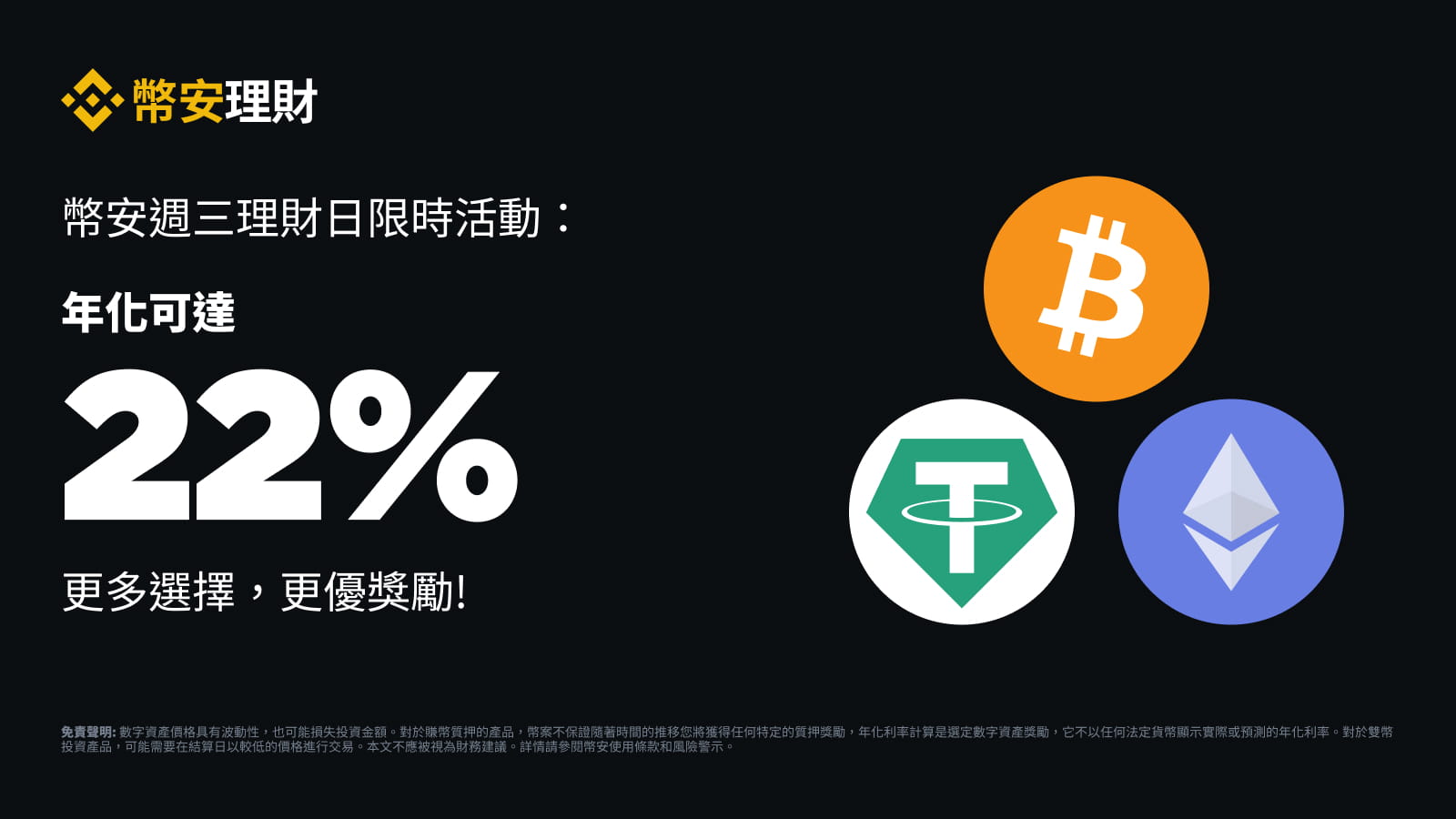 免責聲明:數字資產價格具有波動性,您的投資價值可能會有所波動,也可能損失投資金額。您將自行為您的投資決策負全責,幣安不對任何可能產生的損失負責。保本賺幣質押產品將在協議期結束後或提前贖回時將數字資產返還至用戶的現貨錢包。幣安不保證隨著時間的推移您將獲得任何特定的質押獎勵。年化收益率是您在選定時間範圍內獲得數字資產獎勵的預估值。它不以任何法定貨幣顯示實際或預測的回報率、收益率。年化收益率每日調整,預計收益可能與實際產生的收益不同。對於雙幣投資產品,建議您持有加密資產並可能需要在結算日以低於市場利率的利率進行交易。本文不應被視為財務建議。詳情請參閱幣安使用條款和風險警示。
