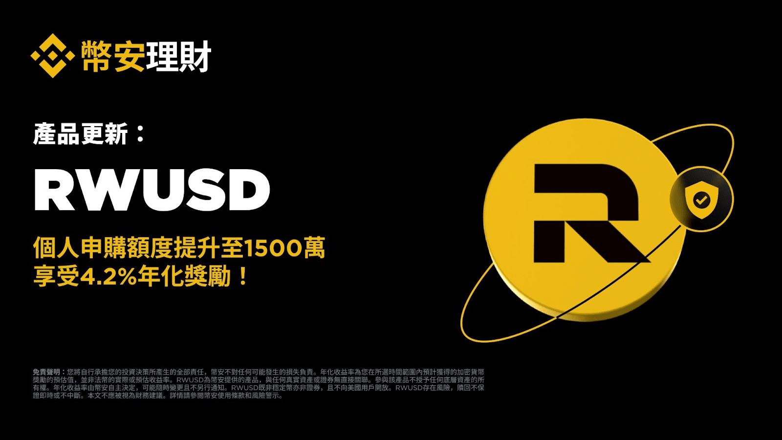免責聲明:您將自行承擔您的投資決策所產生的全部責任,幣安不對任何可能發生的損失負責。年化收益率為您在所選時間範圍內預計獲得的加密貨幣獎勵的預估值,並非法幣的實際或預估收益率。RWUSD為幣安提供的產品,與任何真實資產或證券無直接關聯。參與該產品不授予任何底層資產的所有權。年化收益率由幣安自主決定,可能隨時變更且不另行通知。RWUSD既非穩定幣亦非證券,且不向美國用戶開放。RWUSD存在風險,贖回不保證即時或不中斷。本文不應被視為財務建議。詳情請參閱幣安使用條款和風險警示。