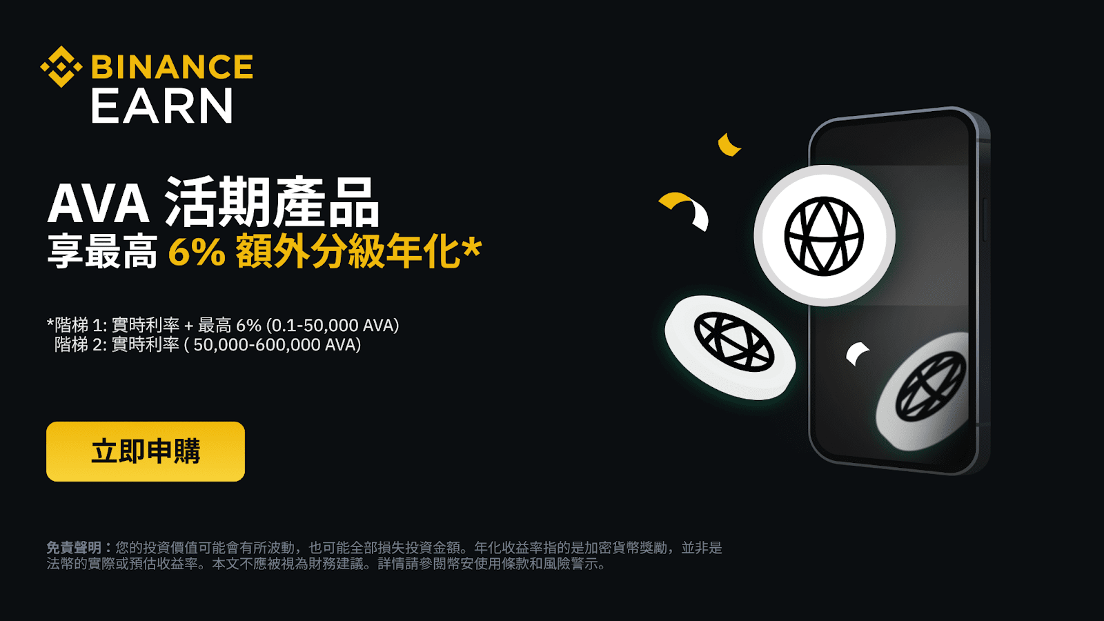 幣安賺幣平台將推出AVA活期產品活動!活動期間,申購AVA賺幣活期產品,除了可獲得實時年化收益之外,還可享受最高10%獨家額外分級年化收益!