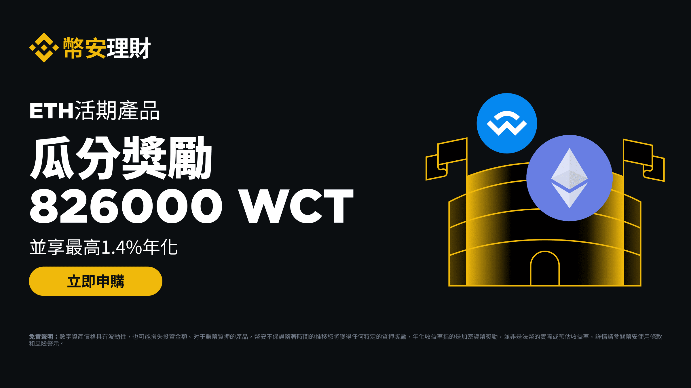 幣安保本賺幣平台推出ETH活期產品雙重活動!活動期間,所有符合資格的ETH持幣用戶,完成新的ETH活期產品申購將有機會瓜分826,000 WCT獎勵。