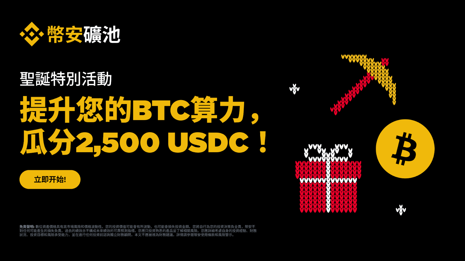 為慶祝節日季,幣安礦池推出聖誕特別活動,凡在幣安礦池挖礦BTC並提升算力的用戶,都有機會分享總額2,500 USDC的獎勵。