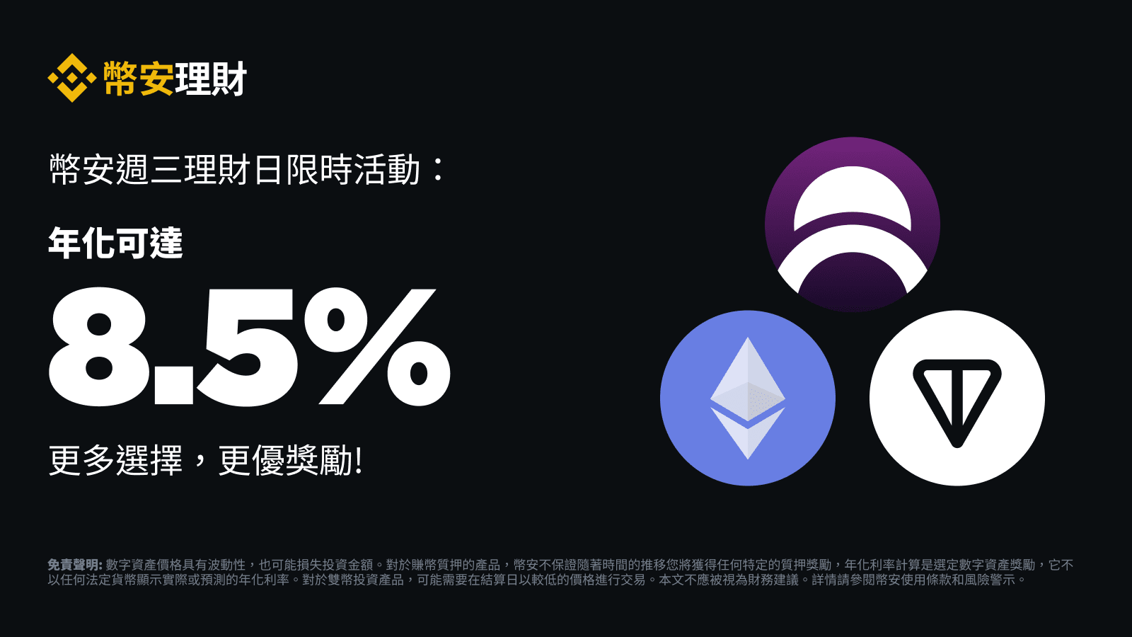 幣安理財每週三為您推出一系列新限時活動。請持續關注“幣安週三理財日”,透過幣安保本賺幣、ETH 質押、雙幣投資等獲得收益。