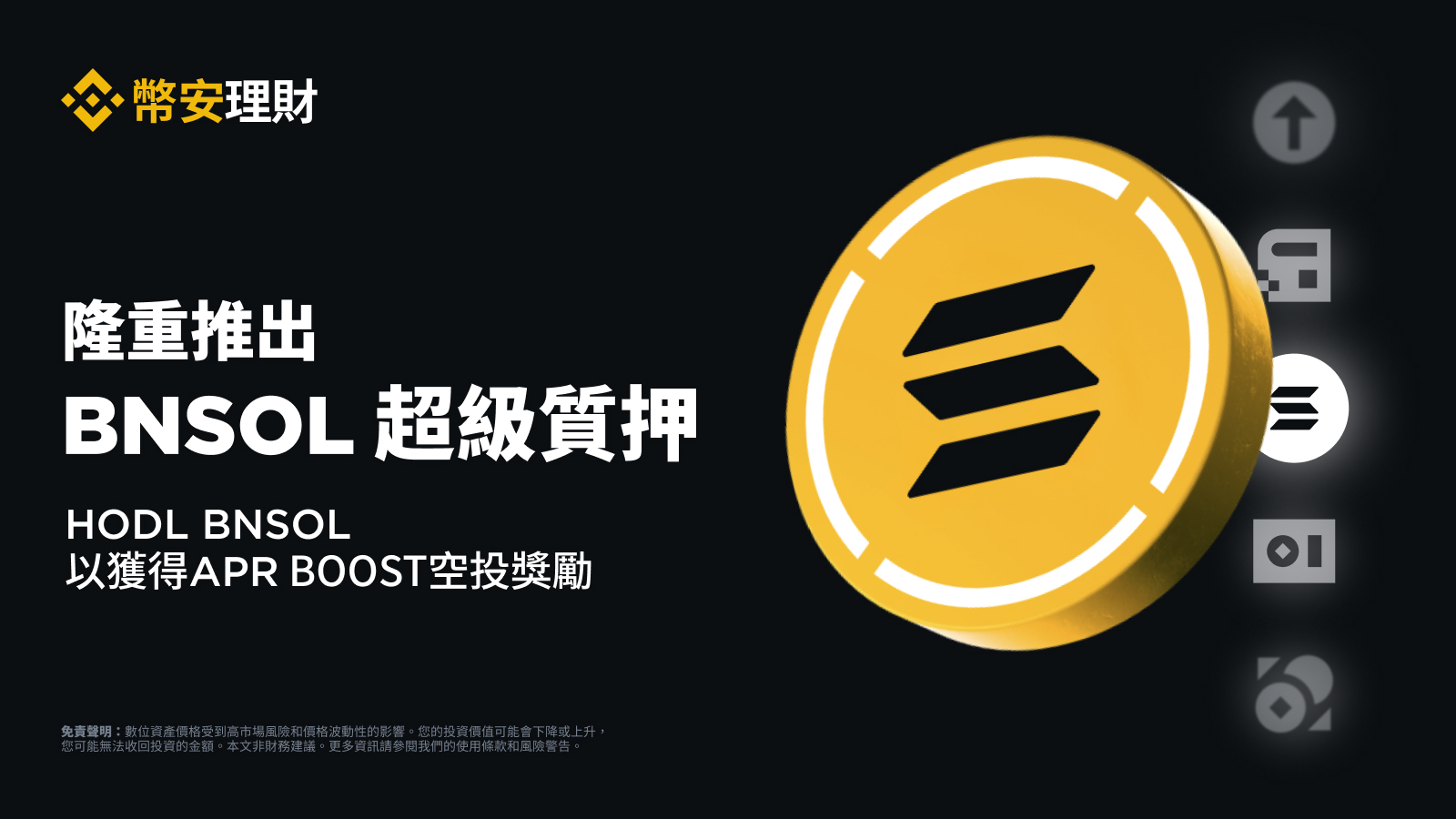只有完成身份認證且質押SOL至BNSOL的用戶。持有BNSOL的幣安母賬戶和子帳戶亦能獲得APR Boost空投獎勵;
